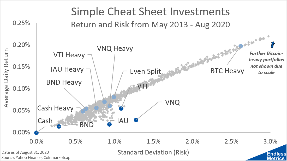 With an estimate of the efficient frontier, we can now optimally tailor portfolios based on return and risk preferences. And, we achieved this with way less work than by brute force calculating the 96 million possible portfolios, approximately 0.001% of the work.