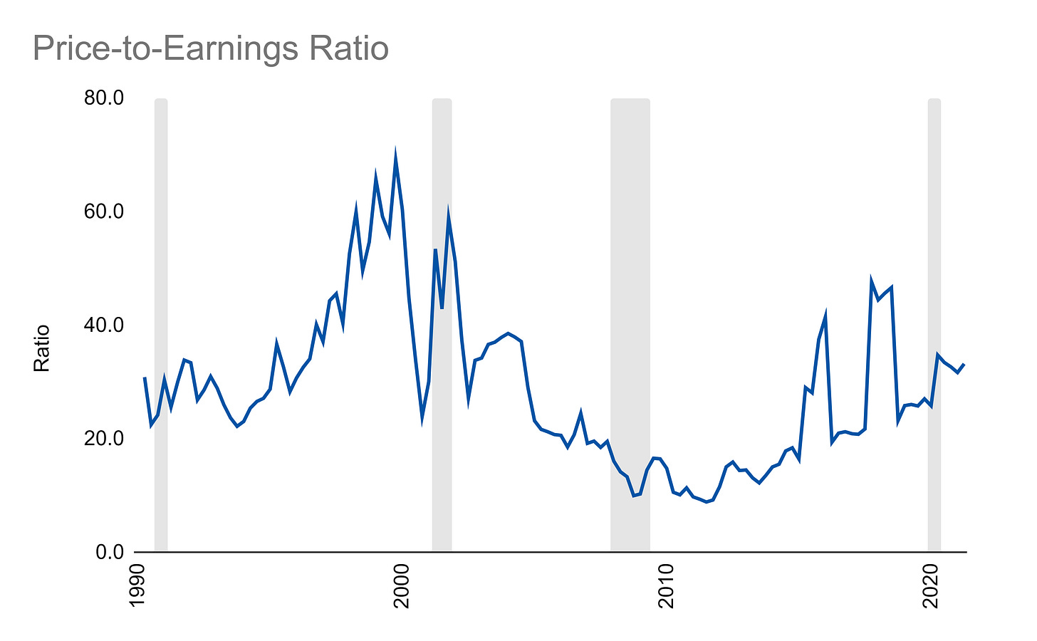 One metric I’ve looked at a bunch is the P/E ratio. For example, here it is for Microsoft over the last thirty years:
