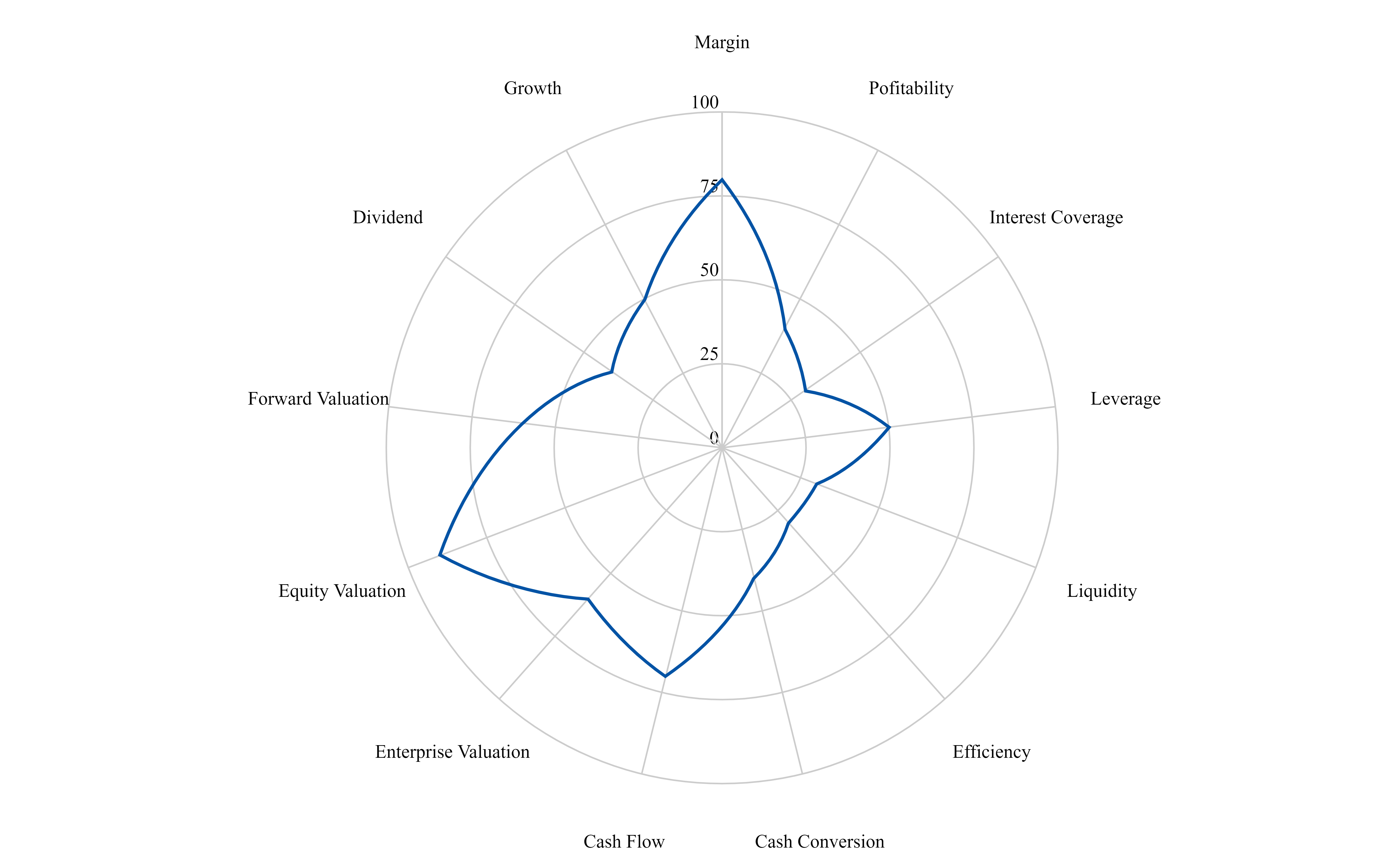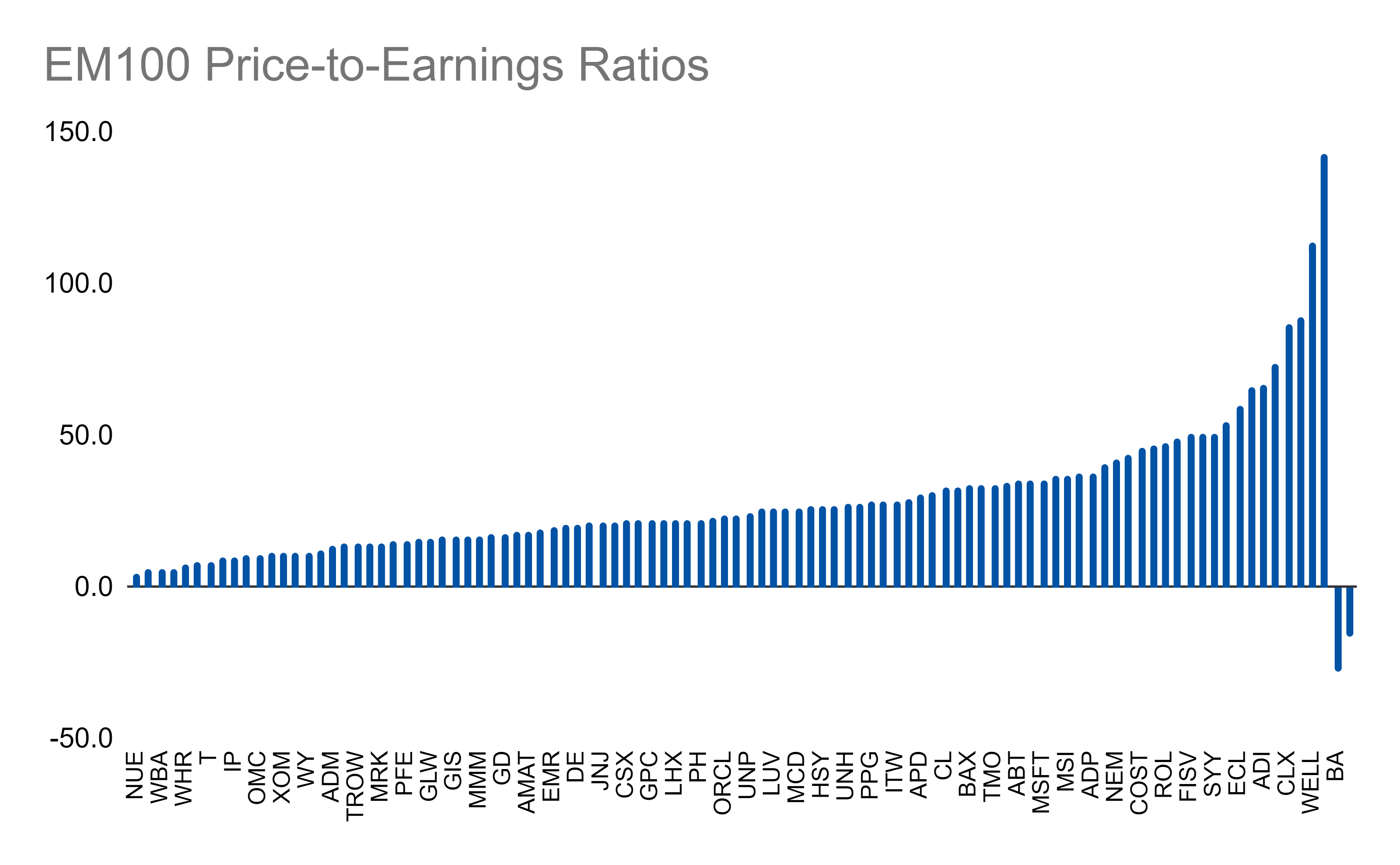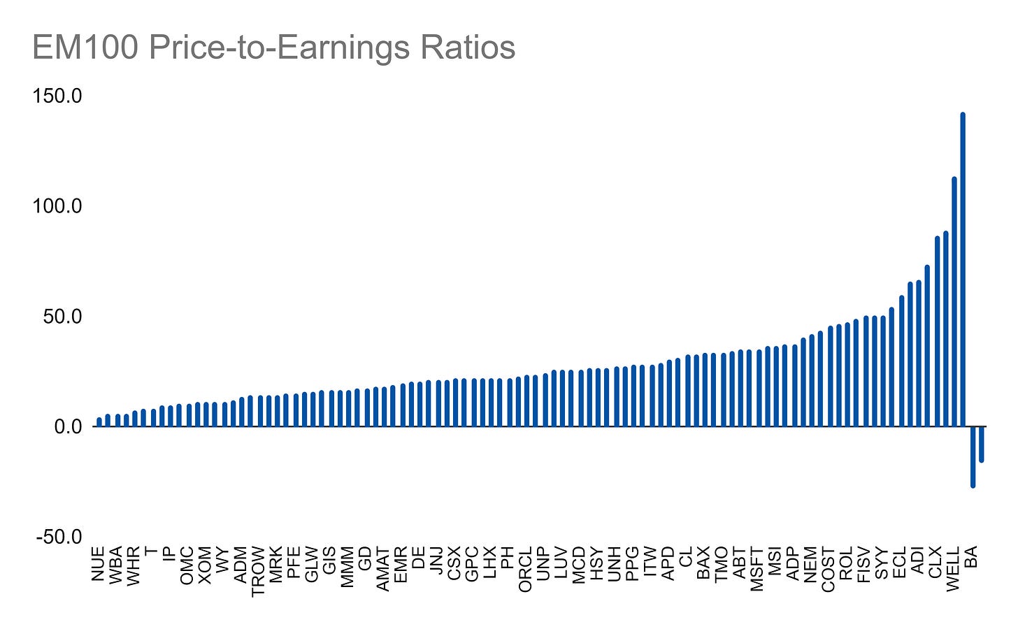 These domains are comprised of 63 underlying metrics, such as the price-to-earnings ratio, which is shown here for the stocks in the EM100: