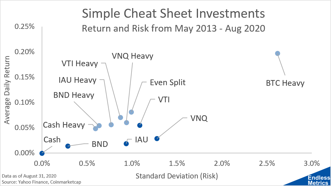 Now, I don’t show Bitcoin by itself on this chart to the make the scale more readable but we know it’s way out there in terms of risk/return. For anyone who has 100% of their portfolio in Bitcoin, I applaud your nerves of steel. That’s not an allocation I’d recommend to the average investor.