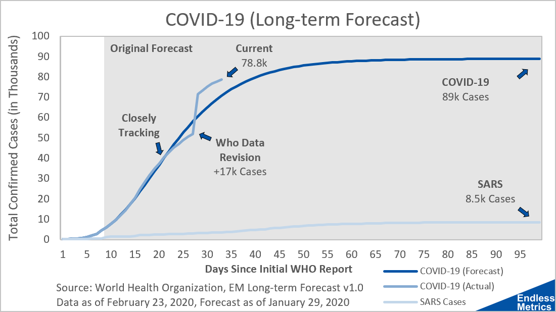 Back on January 30th, I created a long-term forecast for Wuhan Coronavirus (now COVID-19) infections. About a week later, I also did a follow up post to check in on the performance. Since it has been a while since then, I thought I would do another update to assess the situation and give my thoughts. Here is where things stand: