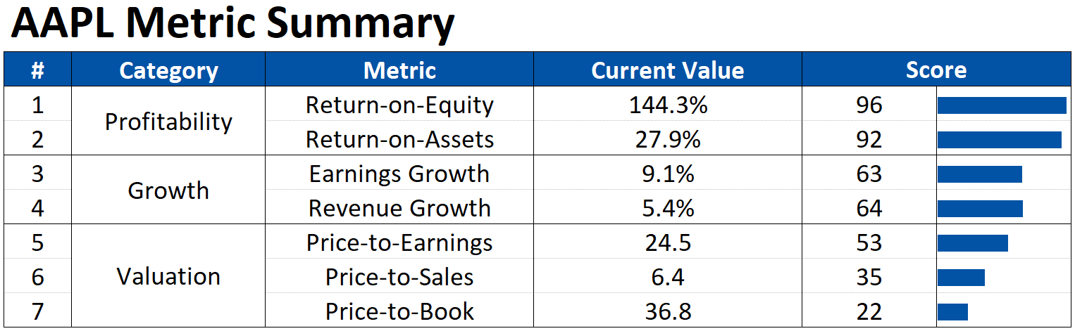 In this table at a glance we can see the current value of each metric and how each one stacks up against the market from 0 to 100 (where higher is better). It’s pretty quickly obvious that Apple has strong profitability and solid growth but that it comes at the cost of an elevated valuation.