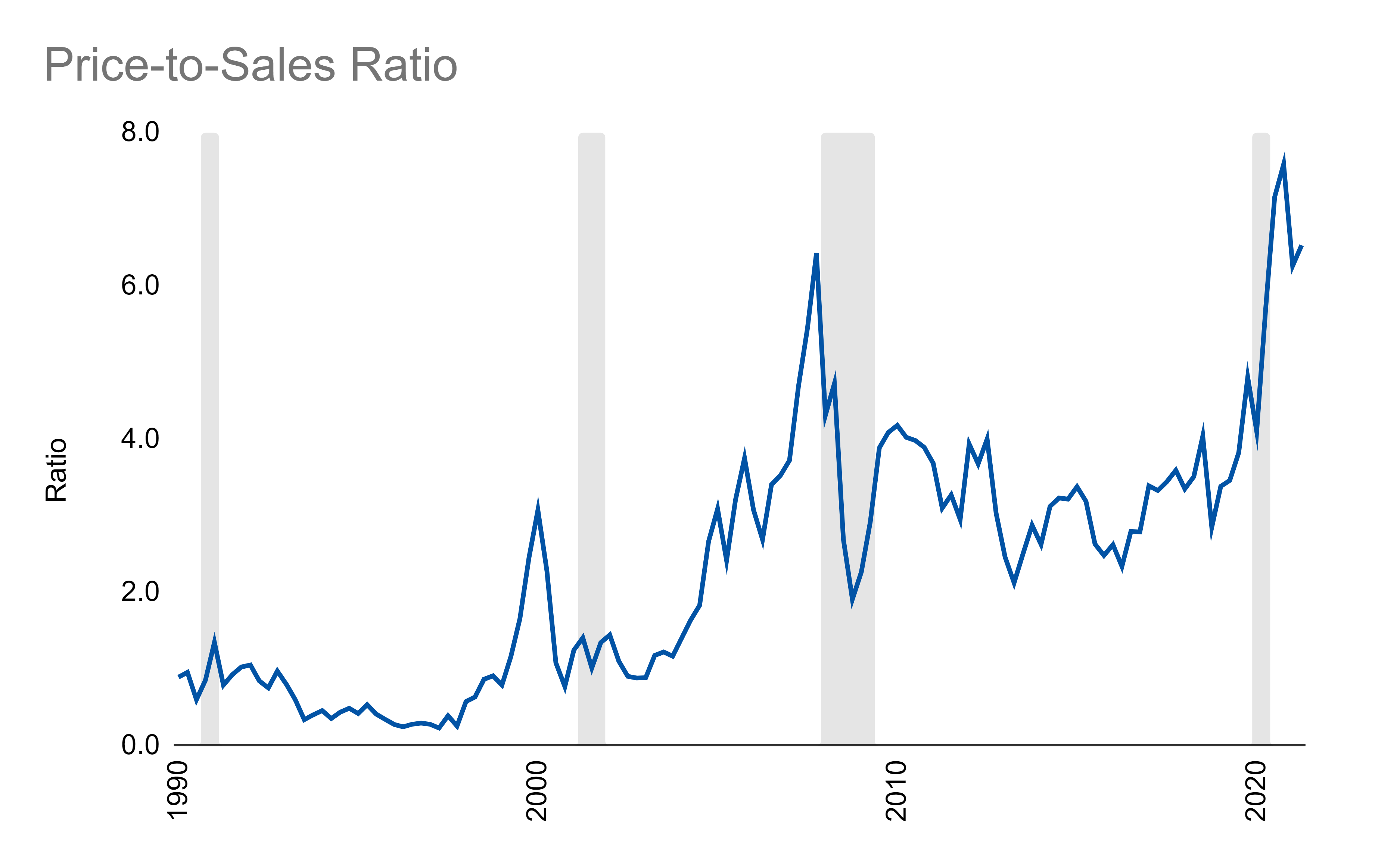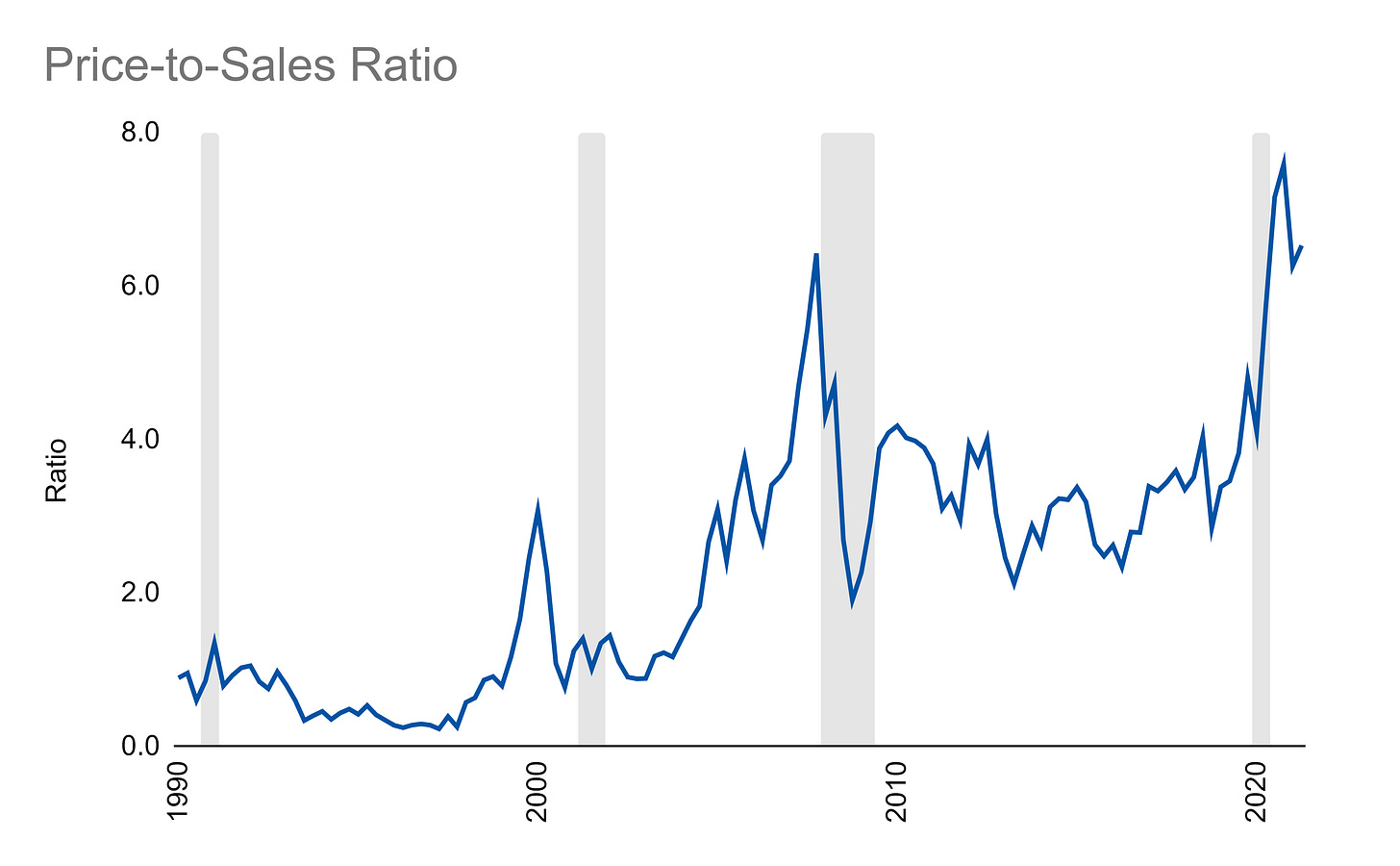 And price-to-sales, which shows us something similar to price-to-earnings but without the craziness: