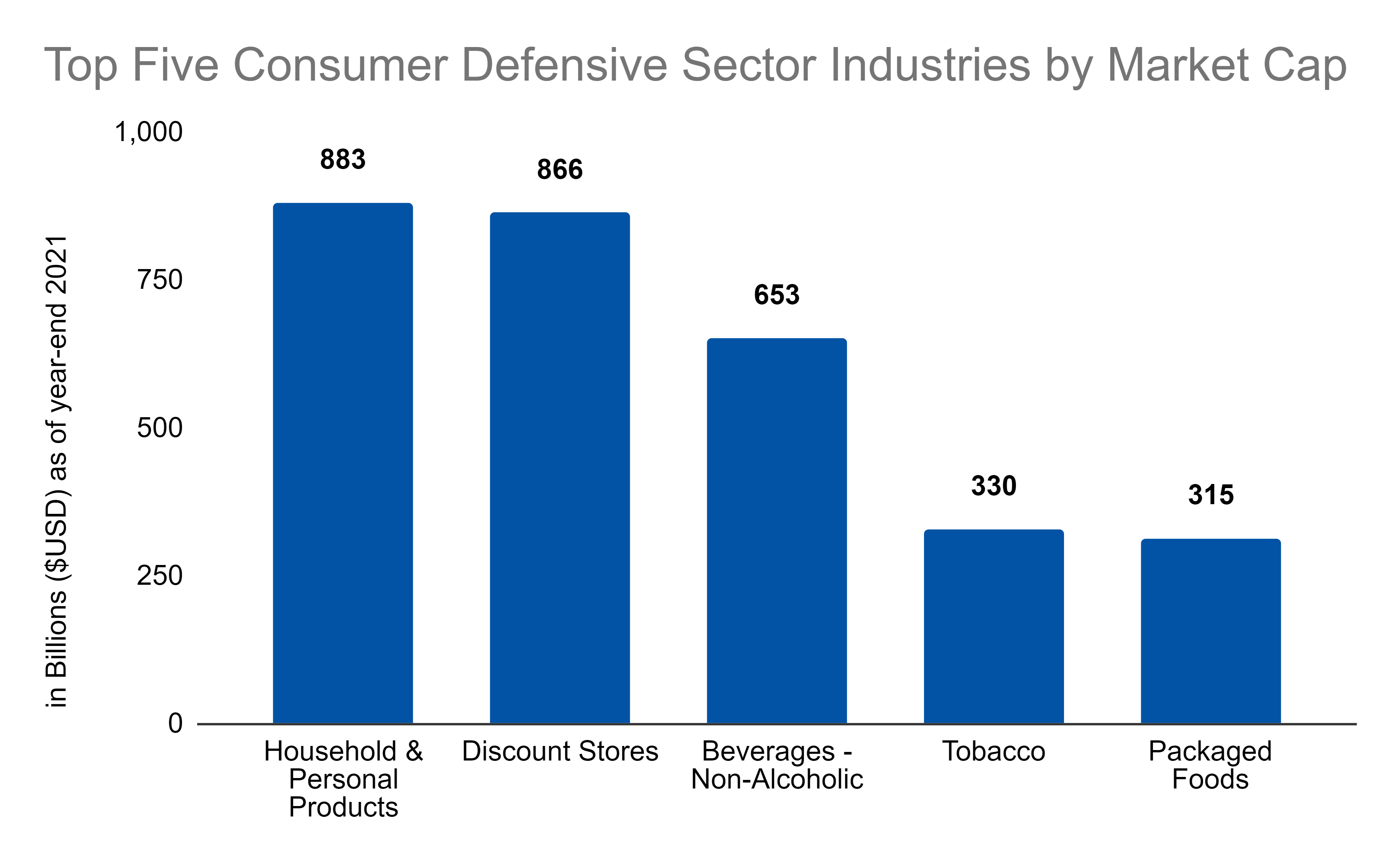 The consumer defensive sector was the seventh biggest sector in the stock market at the end of 2021. It doesn’t even have a single industry over a trillion in market cap, unlike the other sectors we have looked at: