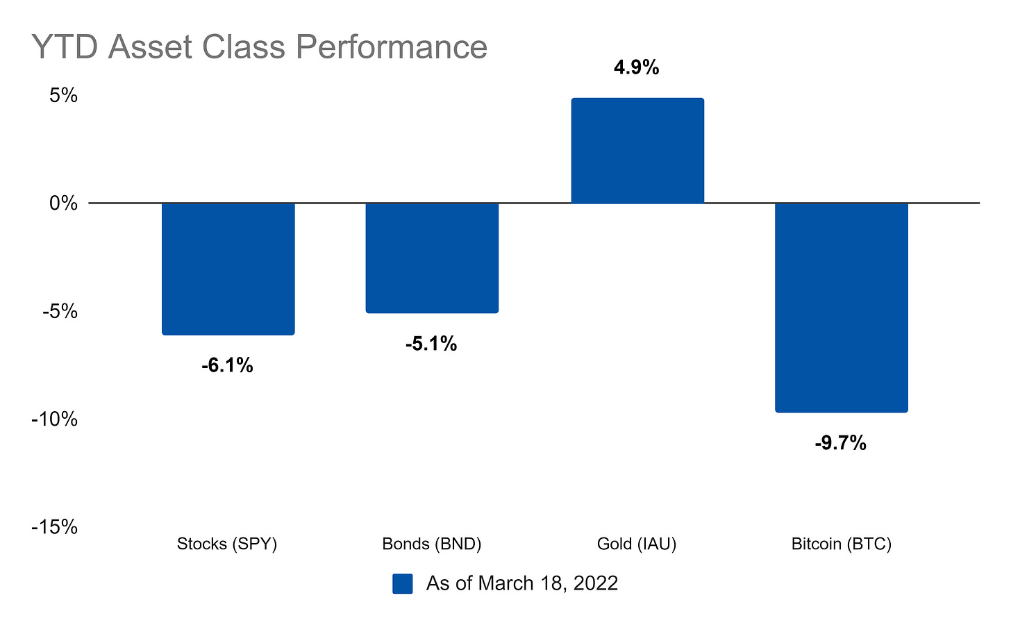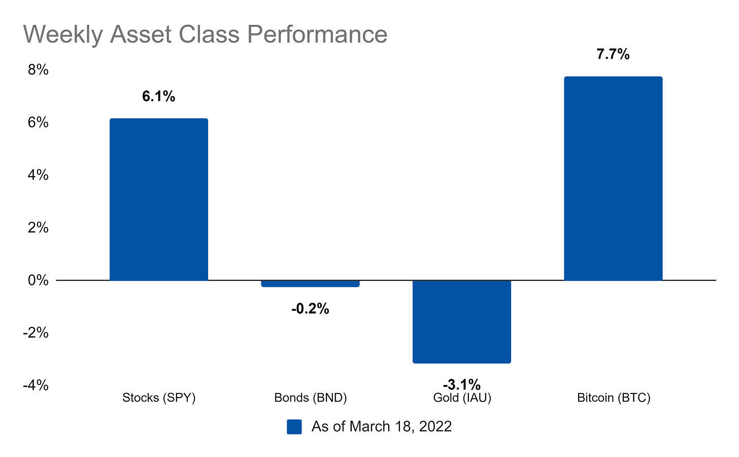 Stocks and Bitcoin ended the week positively while bond and gold were down. As for the year so far, gold is the only winner: