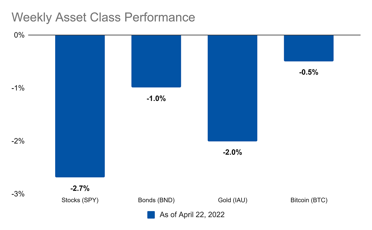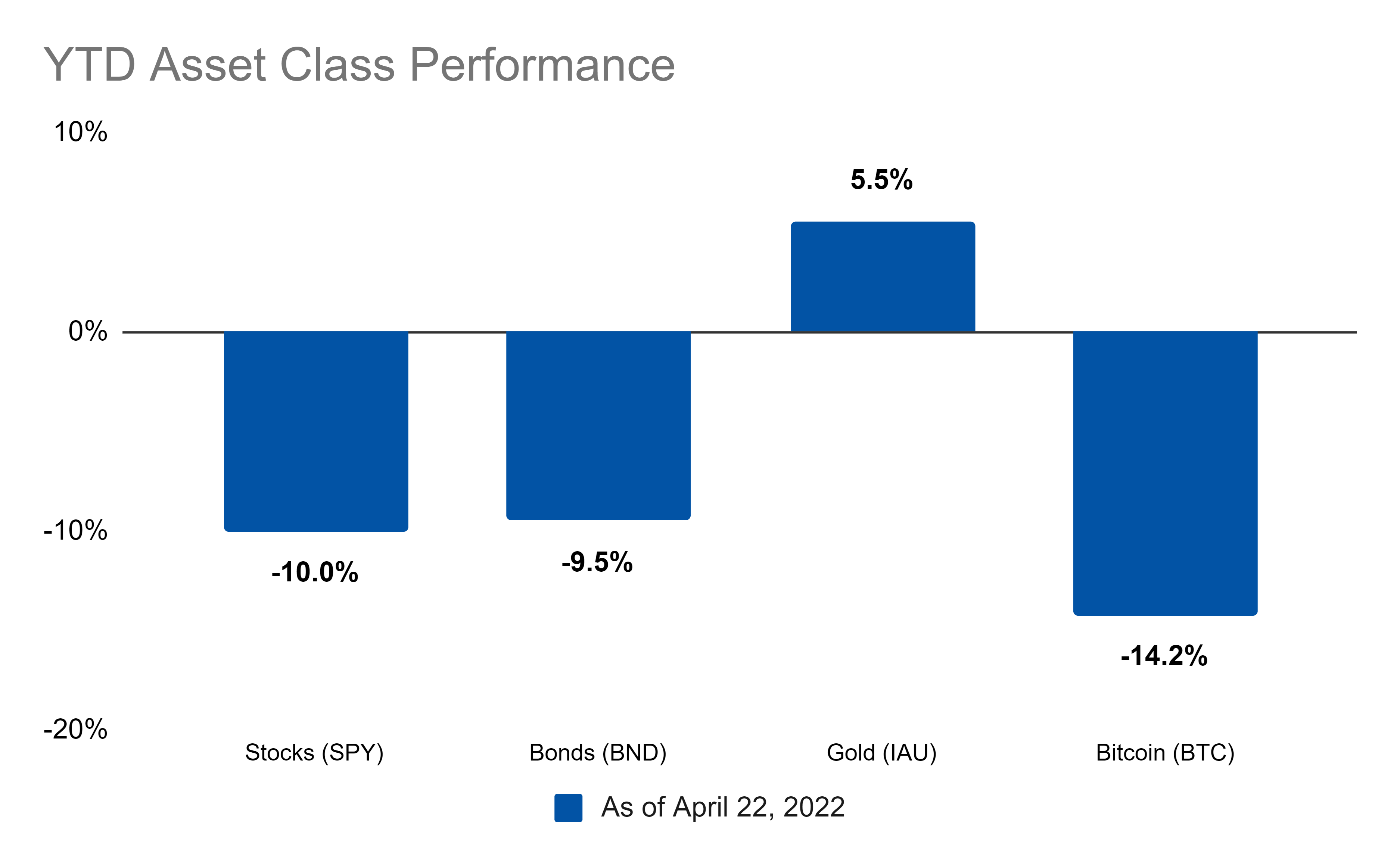 Stocks, bonds, gold, and Bitcoin ended the week down. As for the year so far, gold is the only winner: