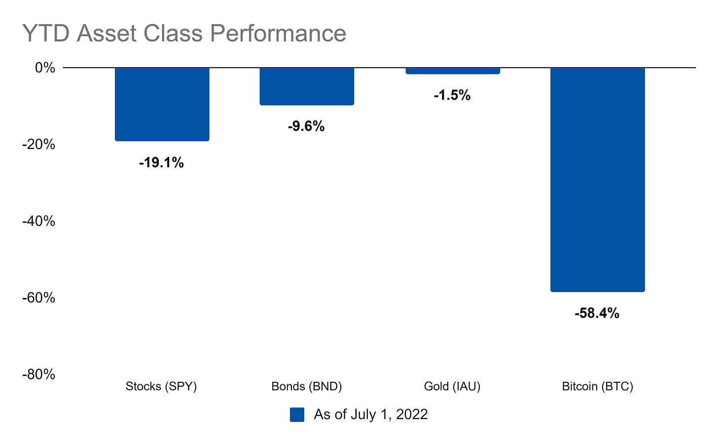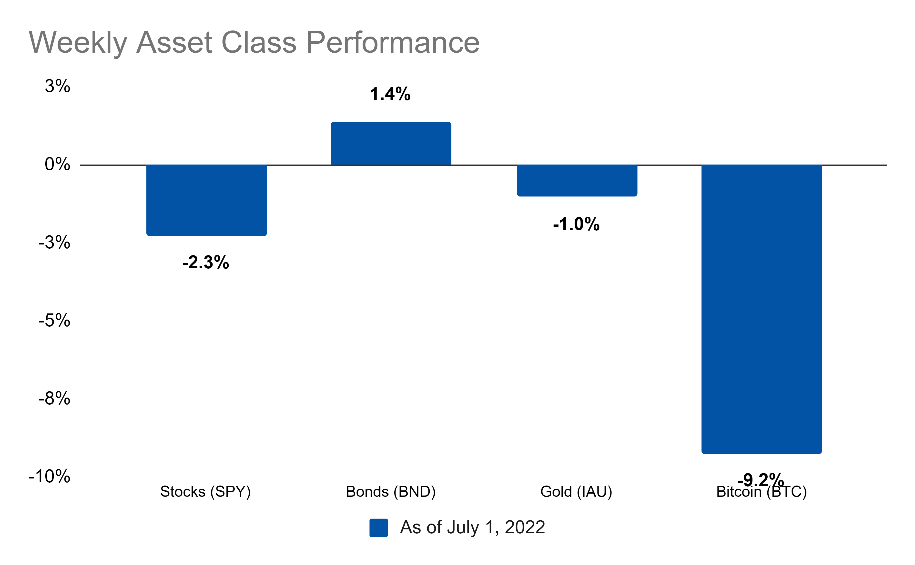 Stocks, gold, and Bitcoin ended the week down while bonds were up. As for the year so far, gold is the doing the best: