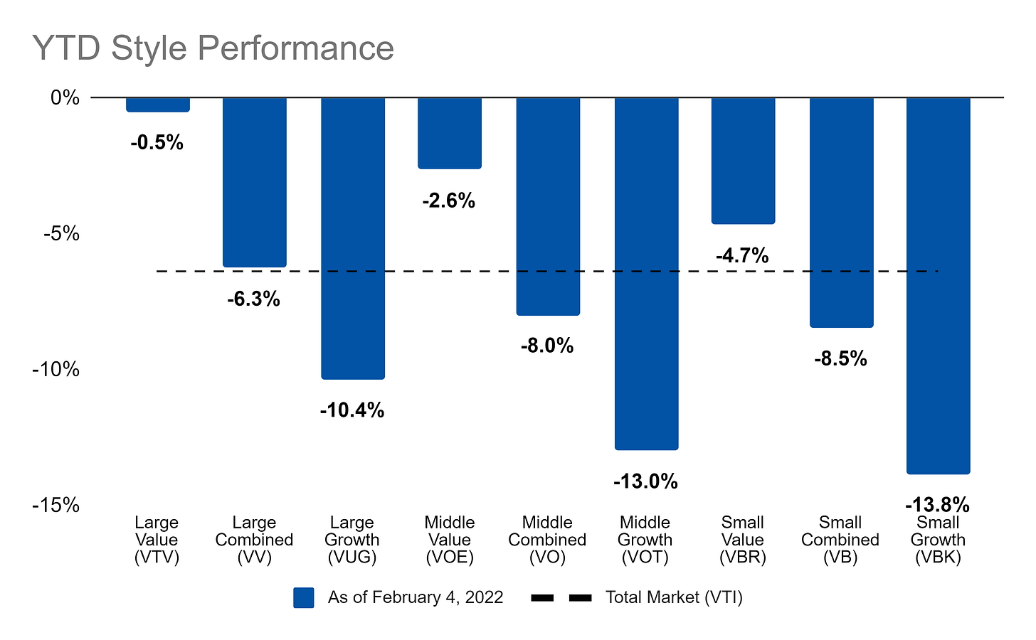 From a style perspective, larger value stocks have been faring better than smaller growth stocks: