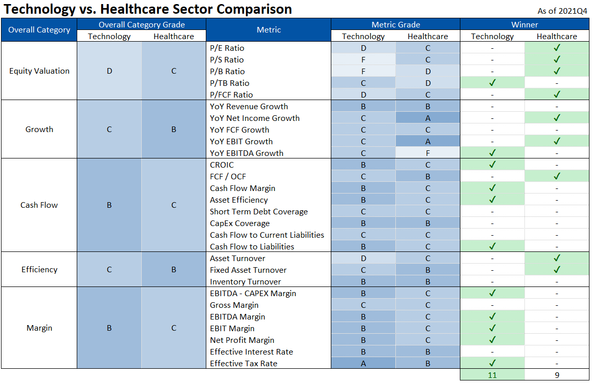 For example, if we put technology head-to-head against healthcare, what do we find? We see that healthcare has an edge valuation wise and in terms of efficiency but also a slight nod for growth, which is a bit surprising. But in terms of cash flow and margin, tech dominates. Overall, technology gets a slight nod based on these 28 metrics!
