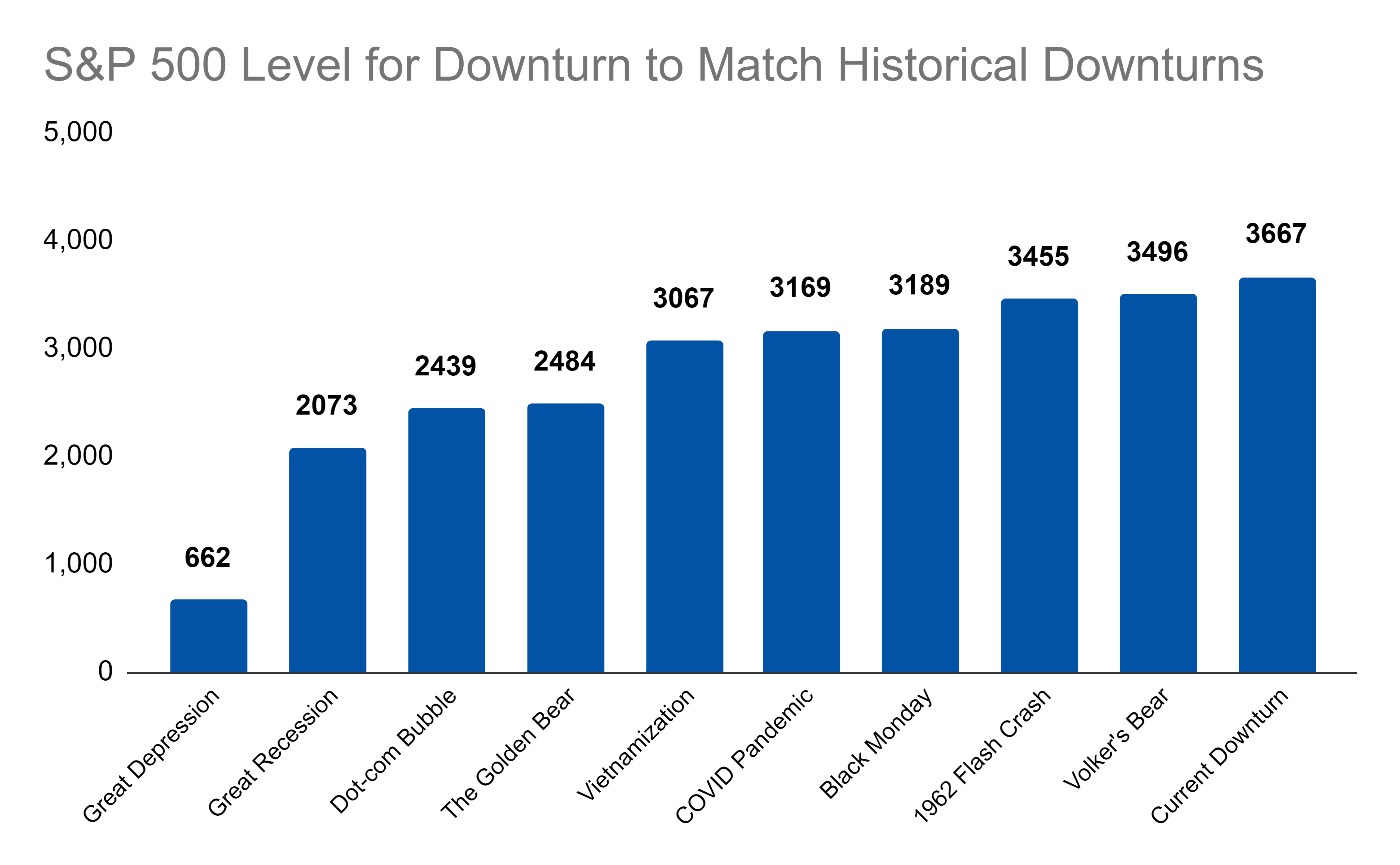 In terms of what level the market would need to fall to in order to reach levels on par with the next nine worst downturns on the list, the next big hurdle is in the 3400 range: