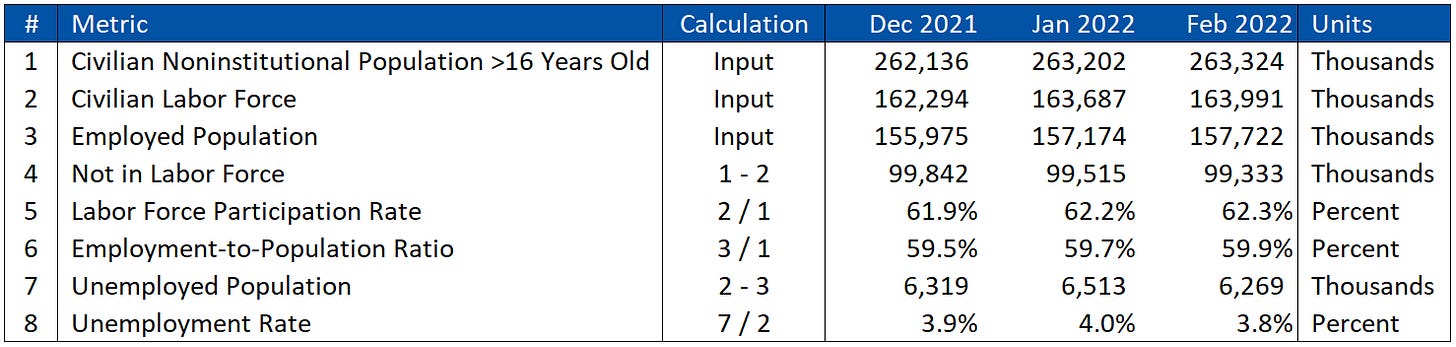 There are a bunch of popular job metrics, with the unemployment rate being, in my opinion, the main headline number. The reality of all these metrics is that they can be boiled down into a few basic inputs - population, employed, and how many people could be employed. Just take a look at this table, where five of the eight metrics are calculated just on those three things: